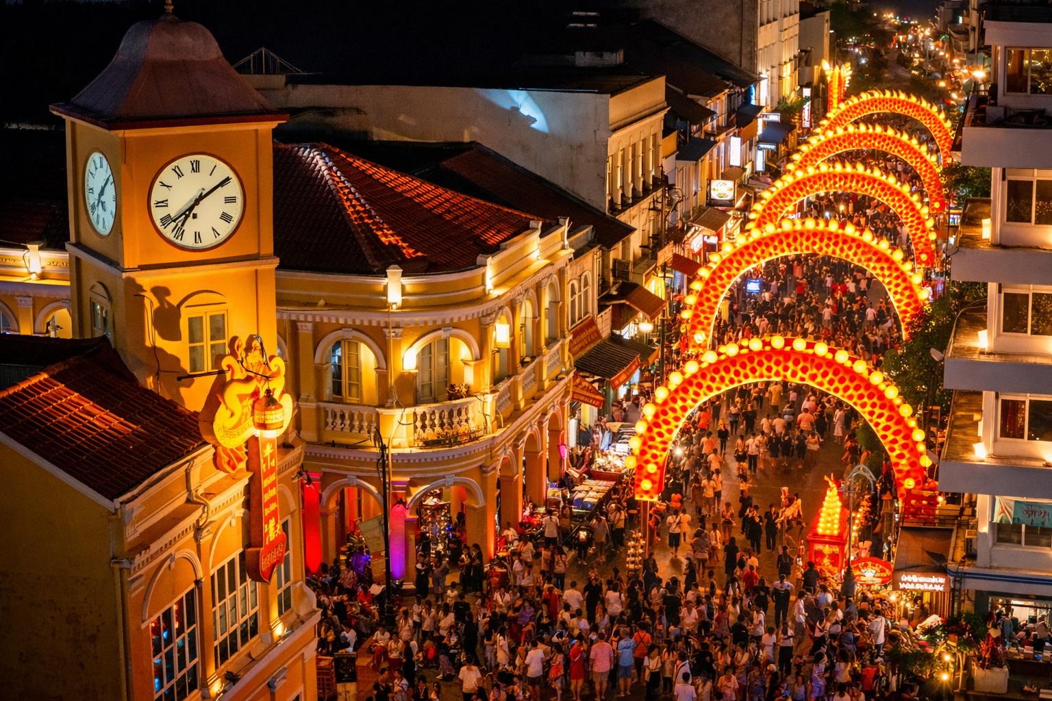 - Thalang Road. This is where the festive transformation is felt most vividly. The facades of Sino-Portuguese buildings are adorned with thousands of red Chinese lanterns, creating the effect of a continuous scarlet canopy over the street.