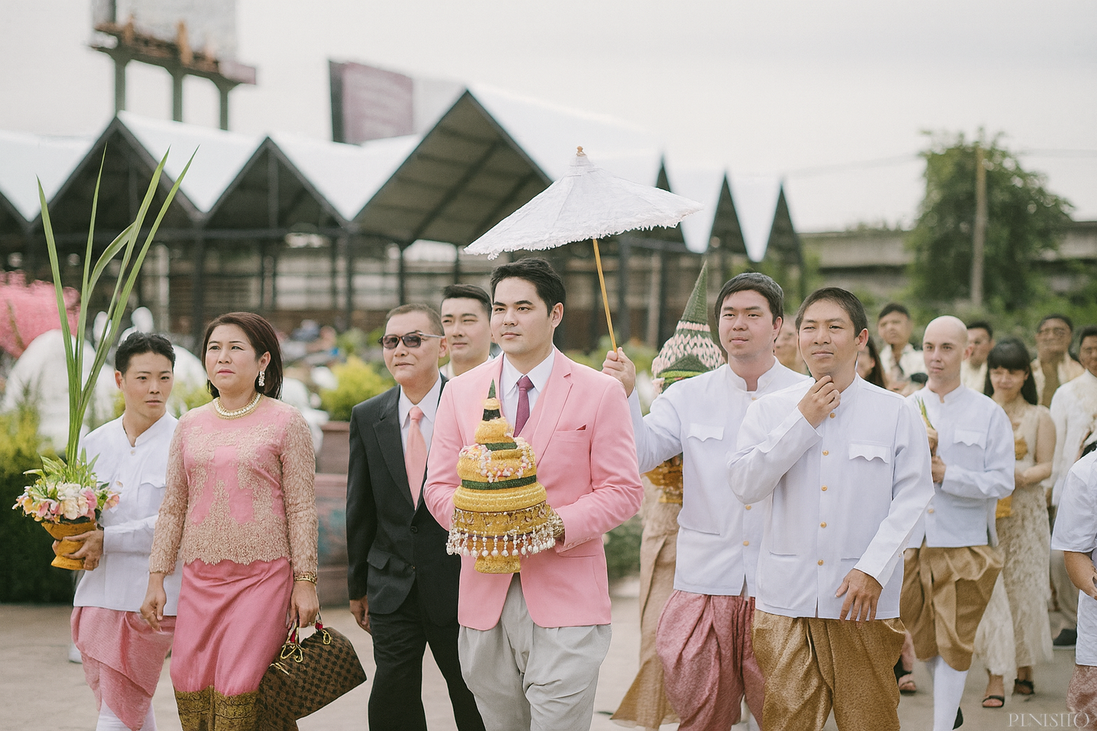 One of the most beautiful moments of a Thai wedding. Wearing sacred garlands, the couple kneels on a pedestal while guests take turns pouring holy water over their hands, offering blessings and presenting gifts. The couple also receives words of wisdom meant to help them build a long and happy life together.