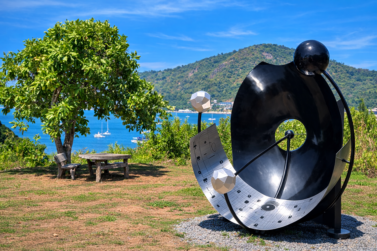 Installed on a grassy slope overlooking the bay, it stands in sharp contrast to the familiar tourist landscape of sea and mountains. According to reports, after the biennale concludes, the sculpture is planned to be moved to Surin Beach, where it will become one of the island’s permanent art attractions.