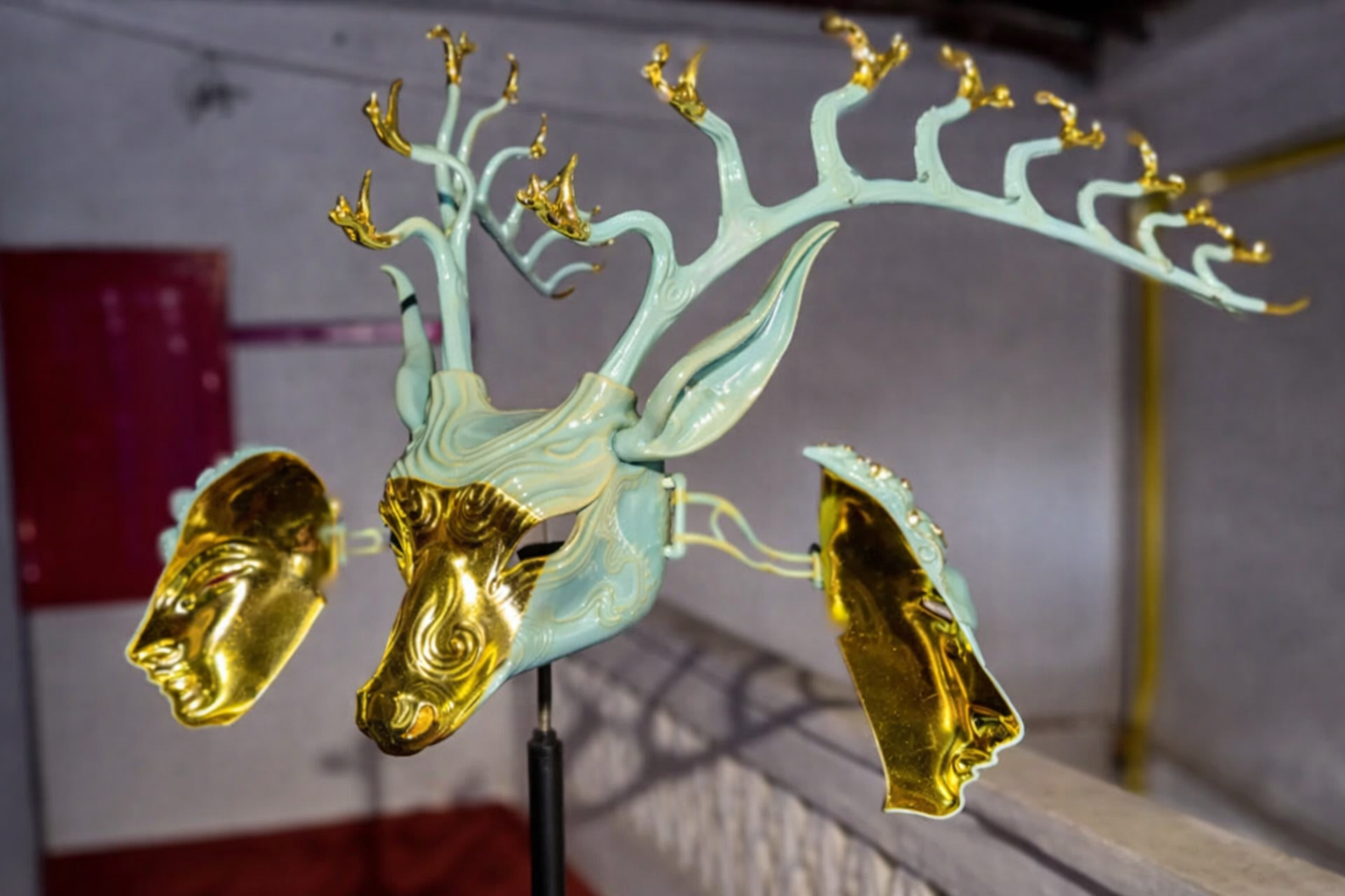 The video is complemented by golden and polymer sculptures of deer masks. They function not only as art objects but also as a kind of “lens” through which viewers engage with the story and symbolism of this mythical animal.