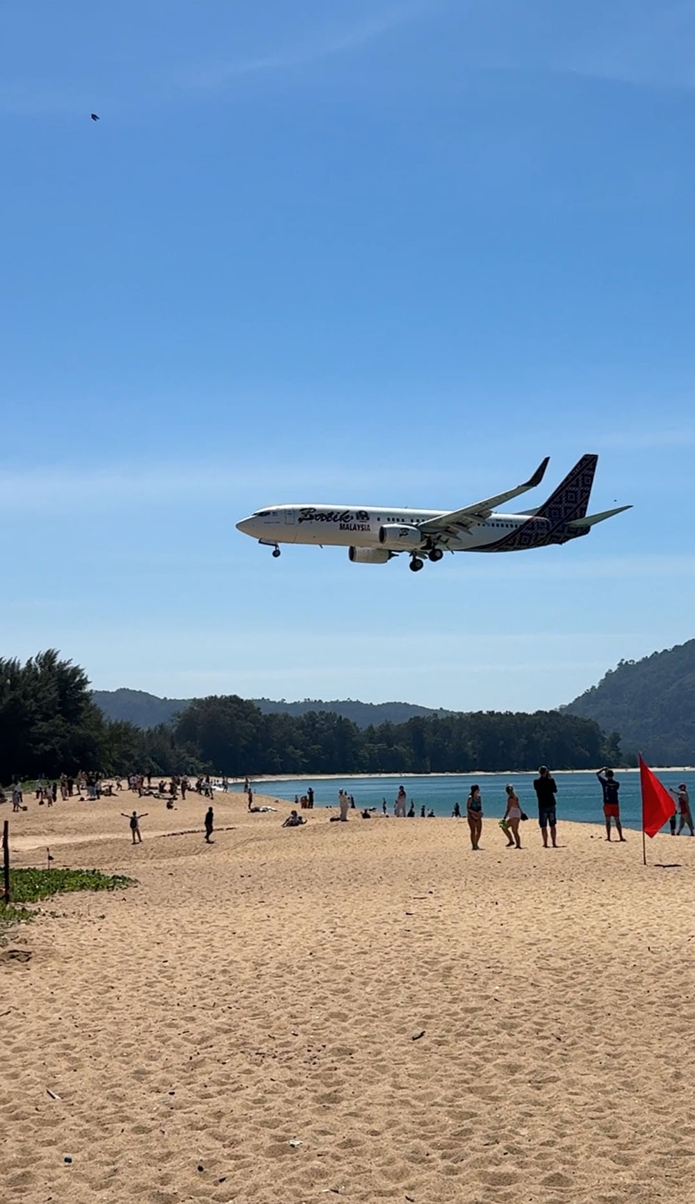 Planes approaching Phuket International Airport come in from the sea (especially during the high season from December to April). Their flight path runs directly over the beach: the aircraft literally “slice” through the sky at an altitude of just a few dozen meters. When an approaching Boeing or Airbus appears, people instinctively freeze, then raise their cameras — and in that moment, some of the most spectacular photographs on the island are born.