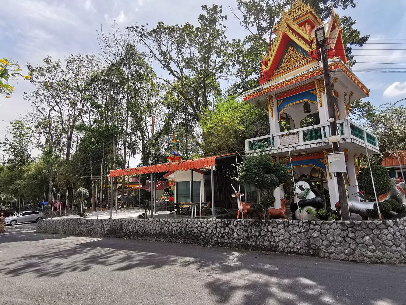 Visitors are welcomed by majestic gates adorned with intricate carvings and symbols. Throughout the temple grounds, one can find sculptures of various animals from Thai mythology – lions, monkeys, and elephants. The temple is single-story, with a staircase on the side leading to the roof, which offers a panoramic view of the surroundings. On the ground level, there is a prayer hall with several small Buddha statues in different poses nearby.