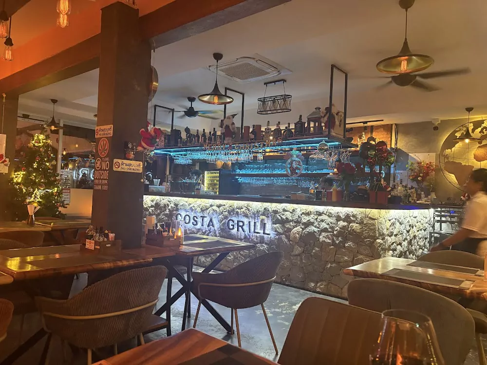 Costa Grill Restaurant on Rawai Beach is a welcoming spot for lunch or dinner, with a distinctly European feel and a light Corsican touch. The space is tastefully designed: soft lighting adds a hint of romance, pleasant music plays in the background, and everything feels neat and well cared for. You can choose to sit on the veranda or in the quieter, air‑conditioned dining room.