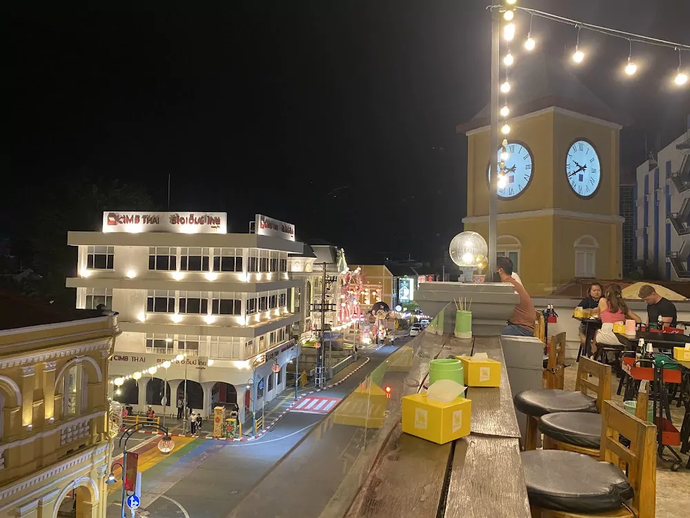 Cuebar sits in the very heart of Phuket Old Town and works as a “two-in-one” venue: a cosy English-style pub downstairs and a rooftop terrace upstairs with views of the Clock Tower. After dark, the place really comes to life — live music sets the tone, from solo guitar to local bands, while the vibe stays easygoing and relaxed. People come here to meet friends, chat, and simply unwind with a drink.