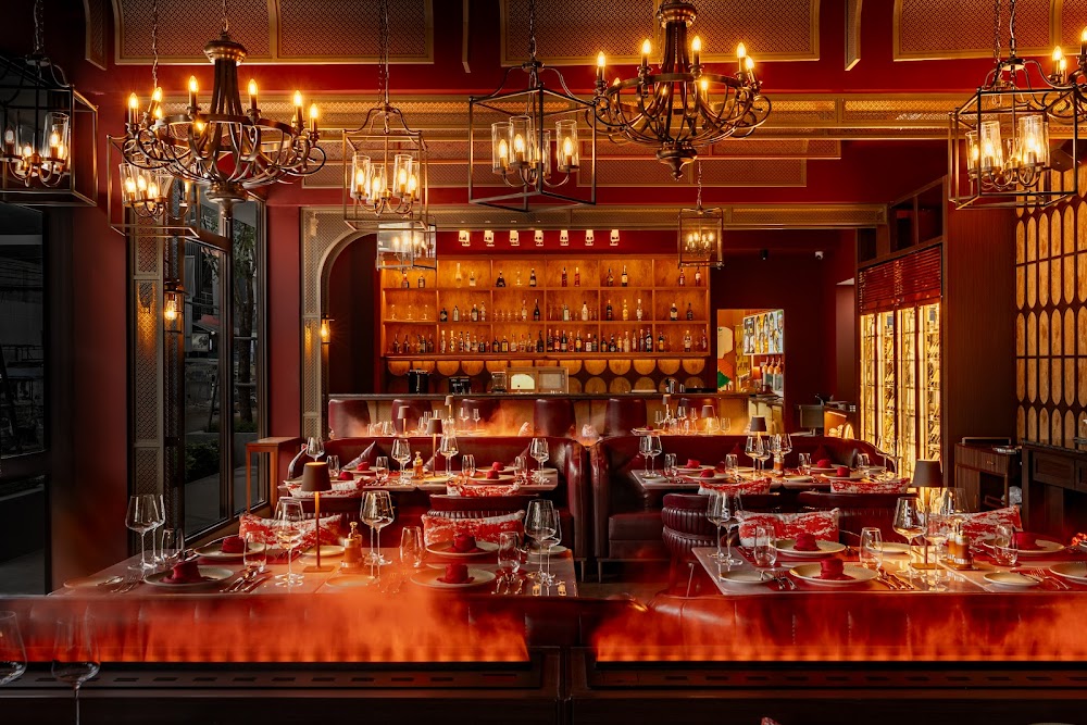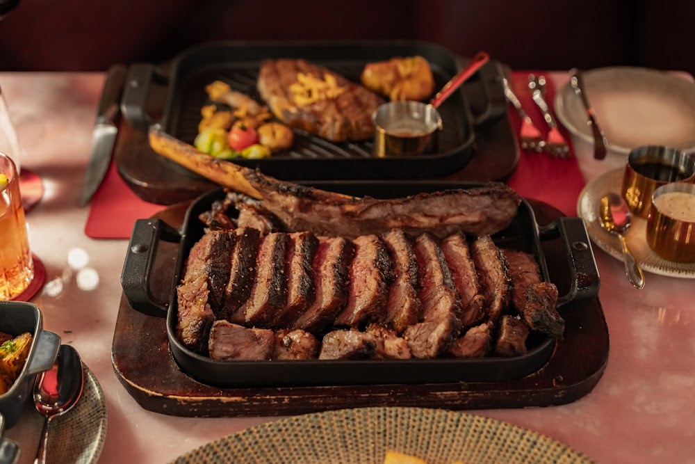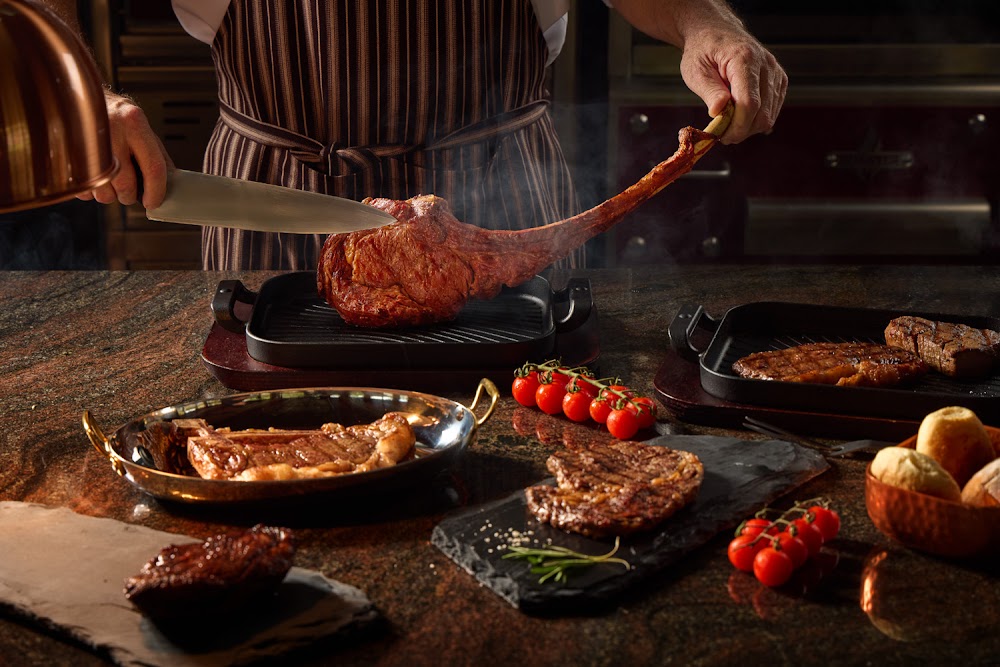 The menu focuses on premium steaks and top-quality cuts, cooked precisely to your preferred doneness — from a juicy ribeye to Wagyu picanha. Some dishes come with tableside service: prime rib is carved and plated right in front of you, steak tartare can be prepared at the table, and crêpes Suzette are finished with a dramatic flambé. You’ll also find vibrant starters and salads, such as burrata with tomatoes, alongside bolder meat options like bone marrow and mashed potatoes with bone marrow. A variety of sauces and sides round out the mains — baked potato, grilled vegetables, spinach flan, and truffle-baked pasta. For guests who don’t eat meat, the restaurant also offers fish dishes.