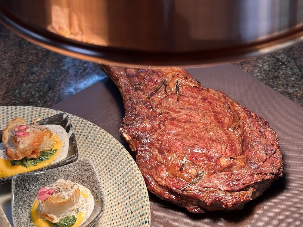Prime & Flame is a modern steakhouse in Phuket’s Kata Noi area, just a short walk from the beach and the Katathani resort. The interior is all about understated, comfortable luxury — especially inviting in the evening for a long, unhurried dinner. The dining room feels polished and elegant, and an open kitchen adds to the experience.