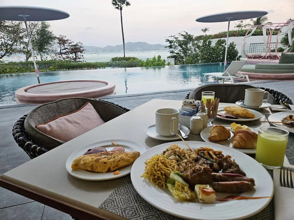 The kitchen focuses on breakfast and dinner. Breakfast is a generous buffet with both Western and Thai options — fresh fruit, eggs, pastries, pasta, fried rice, a dedicated omelette station, plus coffee and tea. The à la carte selection also stands out, with dishes such as green curry and lobster linguine, and desserts like black sticky rice. The coconut cappuccino is particularly worth trying. There’s also a separate kids’ menu.