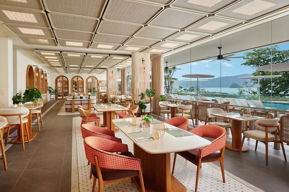 The Parlour in Phuket (Panwa area, at Veranda Resort) is a waterfront restaurant with sweeping ocean views overlooking the resort’s pools. The open-air terrace really comes into its own at sunset: you can see the sea from almost every table, while the atmosphere stays calm and unhurried. Inside, vibrant lounge seating in “flamingo” shades adds a playful resort feel without turning the place into a noisy hotspot.