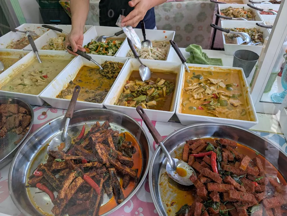 The setup is Thai-style buffet: the food is already on display, and you choose rice with two or three (or more) curries/toppings. There’s a wide selection that changes from day to day, ranging from Thai staples and Phuket specialties to dishes you don’t see everywhere. People particularly praise the meat alternatives (including “vegan pork”) and the rich, flavorful curries. Some options can be quite spicy, though there are mild choices as well.