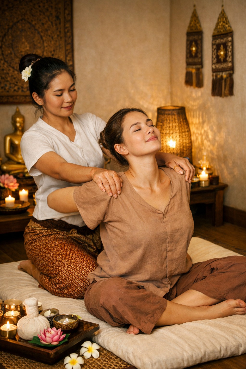 В традиционном тайском массаже не используются масла, а массаж выполняется через одежду. Мастер использует свои ладони, большие пальцы, локти, колени и даже ступни, чтобы проработать ваши энергетические линии и мышцы.