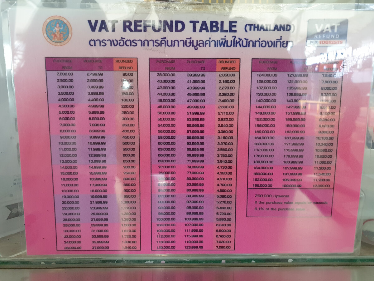 Вернуть получится от 5% до 6,5% от стоимости товара, купленного в Таиланде. Она должна быть не менее 2000 бат. Не во всех магазинах возвращают налог – ищите вывеску "tax free" или "VAT refund" или уточните этот факт у продавца.