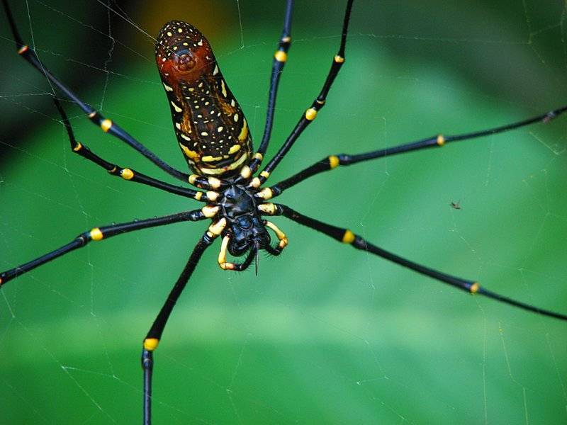 Еще один гигант размером с ладонь. Яд у него, к счастью, работает только на насекомых. Его паутина сравнится с инженерным шедевром: эластичная, как резинка, и прочнее стальной проволоки. Только вот плетет ее этот архитектор обычно прямо над пешеходными тропинками. Так что, смотрите внимательно, чтобы не попасть лицом в такую сеть.