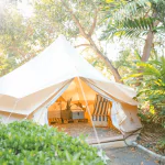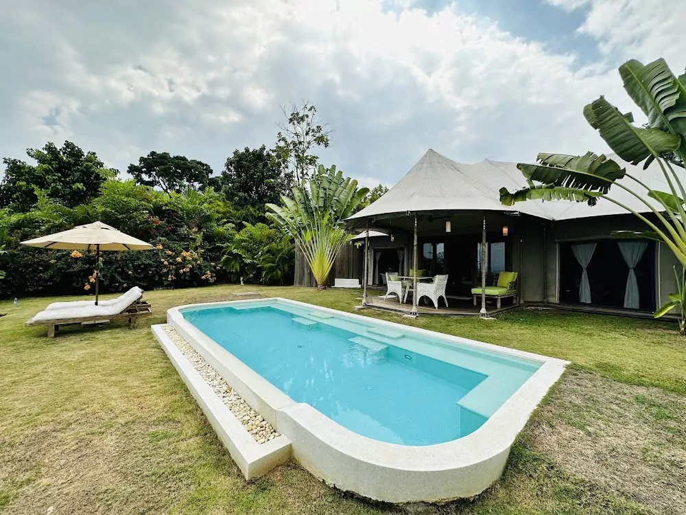 Главный формат размещения — просторные тентовые виллы с приватным инфинити-бассейном и собственным двориком. Внутри — деревянные полы, красивая мебель, кондиционер, удобная кровать с москитным пологом, полноценная ванная зона; есть ванна с видом и наружный душ. Уровень уединения высокий: отдых подходит парам, медовому месяцу и тем, кому важна приватность.