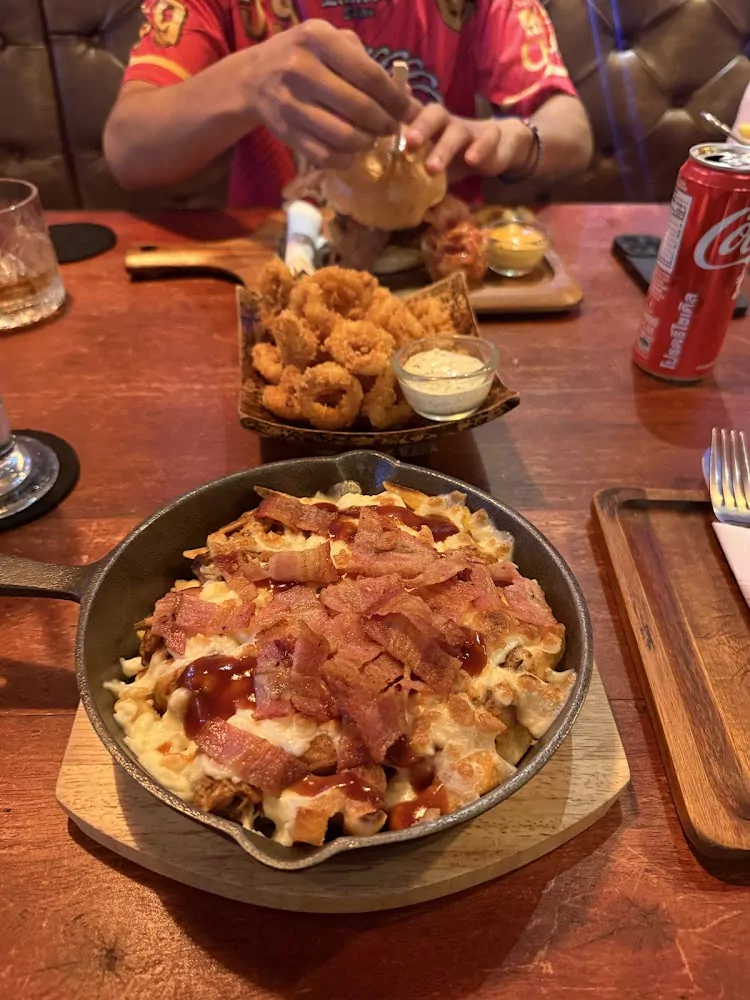В основе меню — бургеры из dry-aged говядины (в том числе австралийской): степень прожарки уточняют заранее и готовят точно по запросу. Вкус строится на балансе — сочная котлета, мягкая булочка, аккуратные соусы без перегруза. Есть интересные сочетания вроде говядины с кимчи и чеддером, а также «классические» варианты. К бургерам берут loaded fries, крылышки и луковые кольца; из напитков подают разливной Chang и вино правильной температуры. Меню хорошо структурировано и дополнено фотографиями блюд и напитков.
