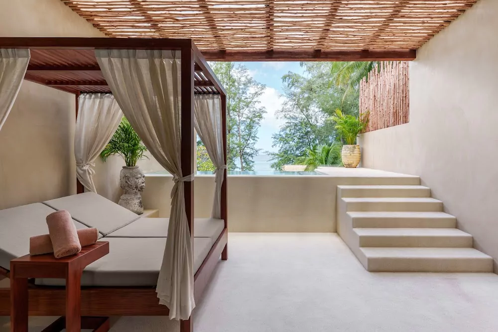 В апартаментах есть просторная спальня, соединенная с элегантной гостиной, где каждый предмет интерьера будто продолжает линию горизонта. Из ванной открывается вид на небо, и можно лежать там часами, наблюдая за перемещениями солнца. На террасе — собственный бассейн с панорамой на пляж, где день плавно перетекает в вечер под ритмы Café del Mar Phuket.
