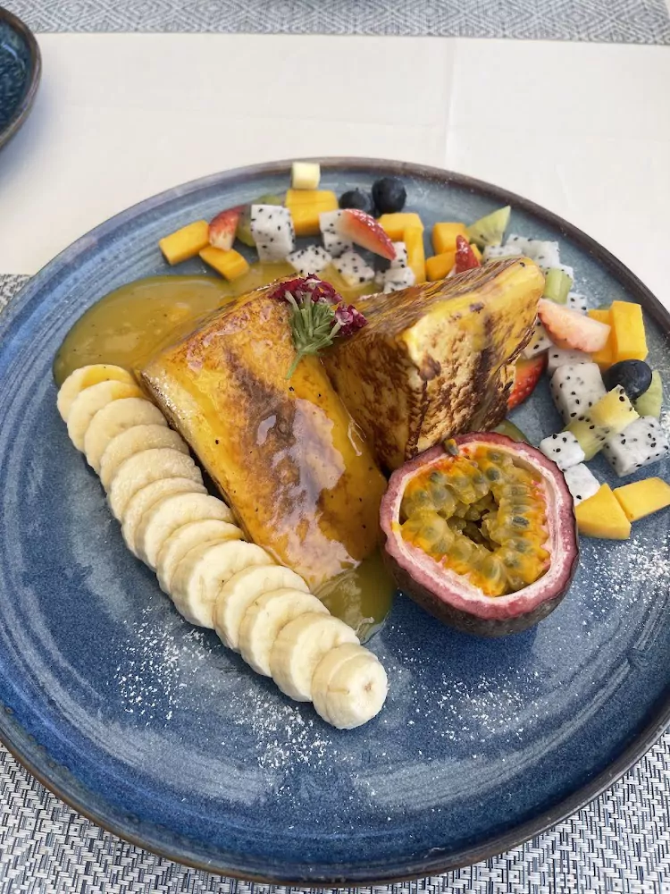Кухня ориентирована на европейские вкусы с местными акцентами: здесь готовят сочные стейки (включая рибай), рыбу и морепродукты, пасту, а также тайские позиции вроде pad kra pow. На завтрак — авокадо-тост, панкейки, асаи-боул, смузи-боулы, вафли с курицей; порции щедрые, подача аккуратная. Для тех, кто избегает продуктов животного происхождения, есть удачные веганские блюда — например мисо-тофу и паста помодоро. По запросу учитываются безглютеновые предпочтения.