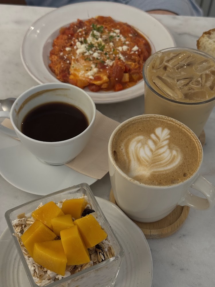 Главная сильная сторона — кофе: насыщенный эспрессо-бар, капучино и flat white, есть фильтр, который подают в термосах, а также редкий для Пхукета вкусный decaf. В меню напитков встречаются раф, матчa, в том числе заметный манго-матча, и фруктовые чаи. Воду приносят бесплатно и пополняют в течение визита.