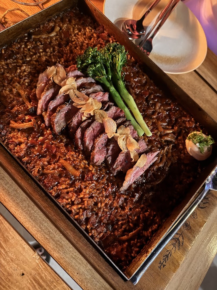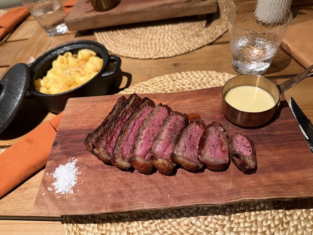 Кухня построена вокруг стейков и морепродуктов. В меню есть вагю (в том числе стриплойн) с соусом чимичурри, тартар из тунца, европейские закуски и гарниры вроде спаржи и картофеля фри с трюфелем и пармезаном. Соусы подобраны удачно и поддерживают вкус мяса. На десерт подают баскский чизкейк. Барная карта включает коктейли, крепкий алкоголь; также доступны сигары.