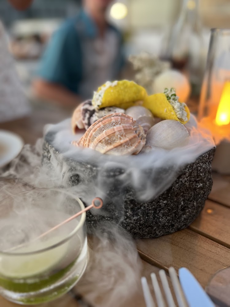 Вечером пространство заметно меняется: после ужина ресторан превращается в клубную площадку с DJ, танцами и зоной у бассейна. Проводятся тематические события — например, ladies night около 20:00 с комплиментарными безлимитными напитками и огненным шоу; по пятницам бывает формат буфета «all you can eat» со стейками.