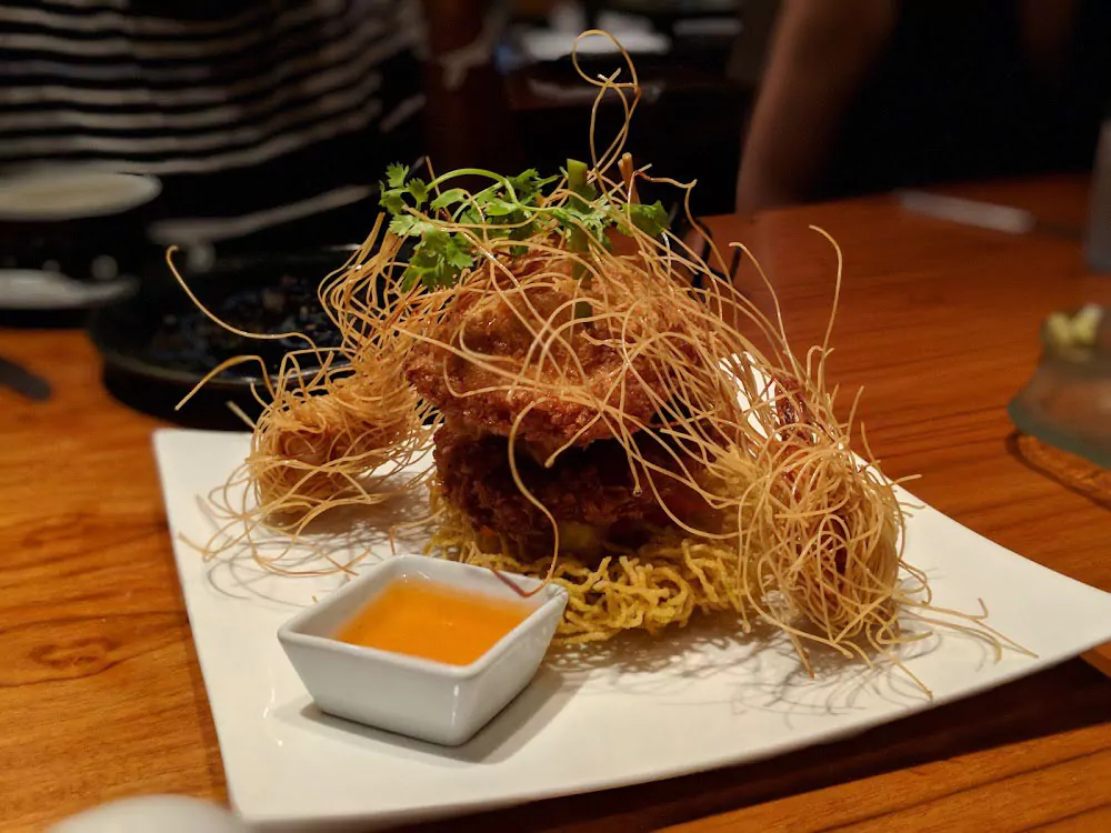 Завтраки здесь обильные: много выпечки, есть и тайские, и западные варианты, а также крепы и панкейки. На ужин подают как тайскую классику, так и более привычные блюда: удаются курица кешью, пад-тай, ананасовый жареный рис, мясные позиции и бургер. Среди запоминающихся блюд — цельная рыба во фритюре; том-ям может быть в более сливочном исполнении с заметной долей кокосового молока.