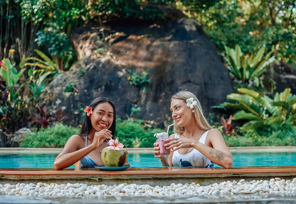 Центр жизни — кафе у бассейна: здесь завтракают, берут кофе, соки и полноценные блюда (в том числе тайские), многие работают с ноутбуками. Wi‑Fi чаще всего стабильнее именно в зоне кафе, в палатках сигнал бывает слабым.