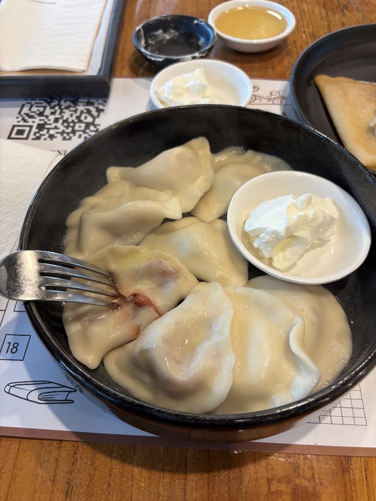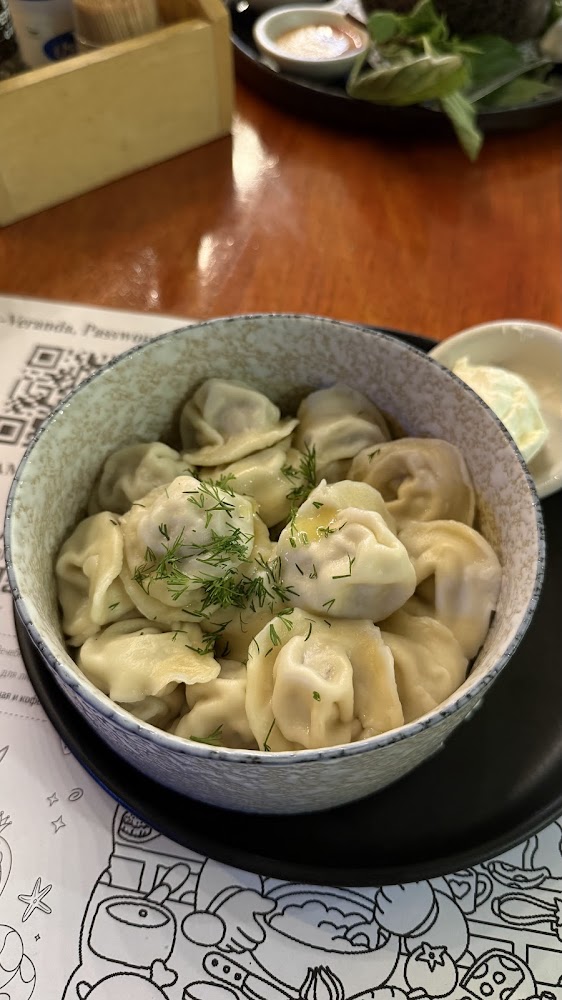 Основа меню — русская кухня: на столе появляются наваристый борщ с хорошим количеством мяса, пельмени и вареники (в том числе с картофелем и клубникой), окрошка на квасе, оливье, блины, драники, сырники, каши на завтрак, котлеты с пюре. Есть и мясные позиции вроде шашлыка на углях, а к нему — салаты; «Цезарь» хорошо заходит детям. Отдельный плюс для семей — детское меню и небольшой детский уголок с мультиками: ребёнку проще поесть привычную еду без экспериментов со специями.