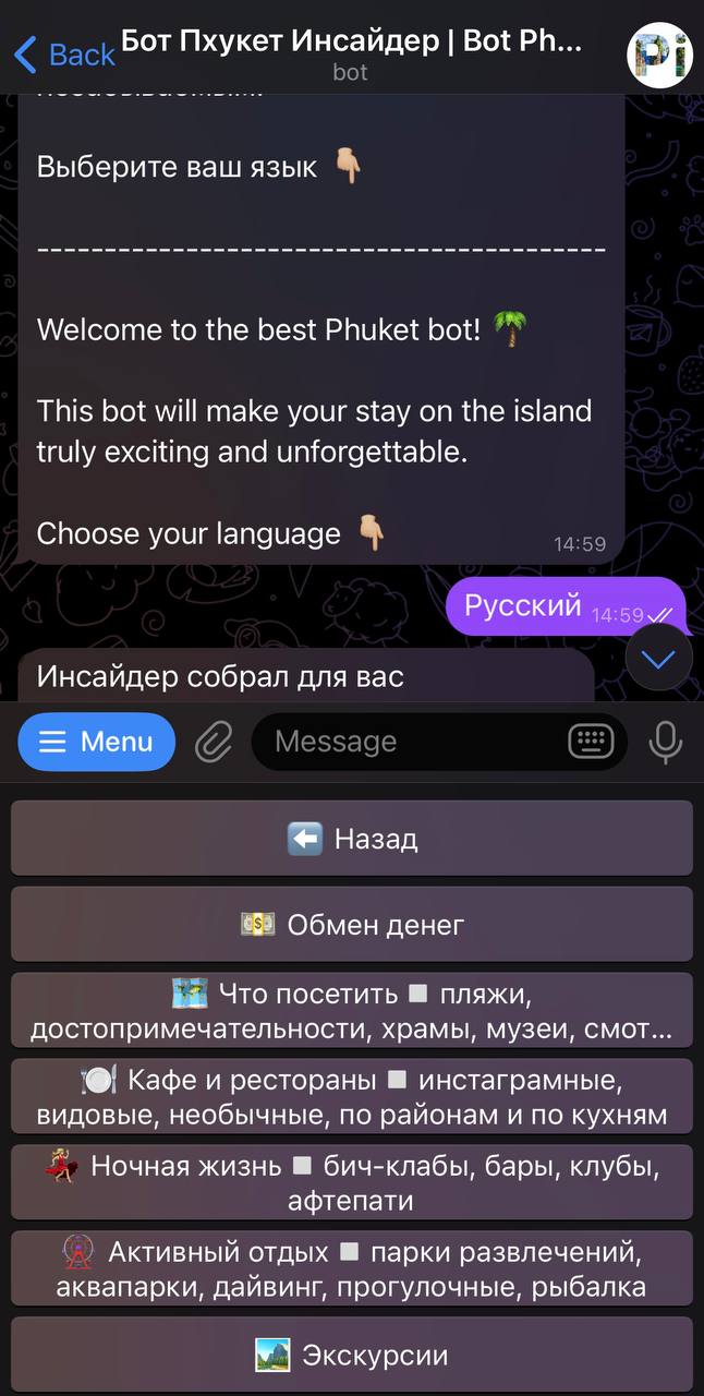 И еще один супер полезный источник информации на Пхукете – наш бесплатный телеграм-бот https://t.me/phuket_insider_bot Там вы найдете все нужные локации на острове, сможете оставить заявку на аренду жилья, транспорта, получение визы, экскурсии и многое другое.